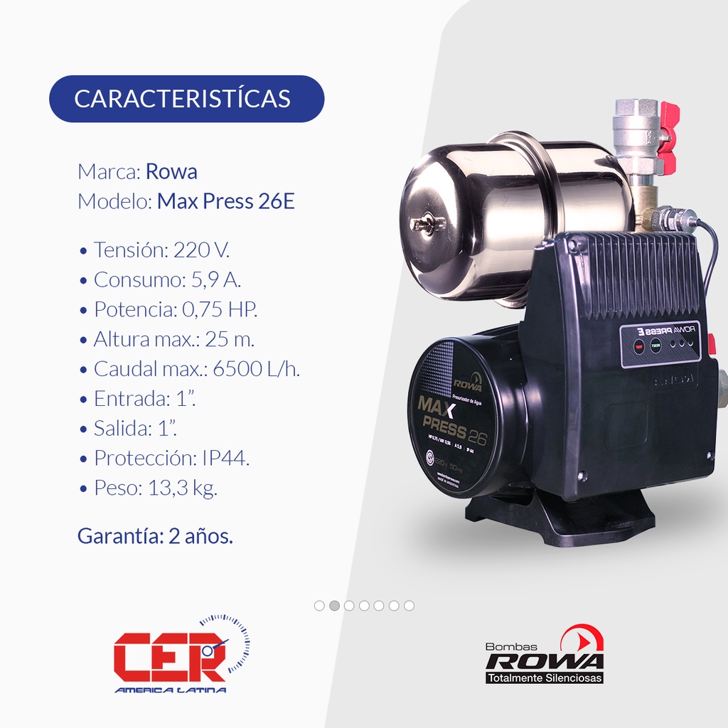 BOMBA PRESURIZADORA ROWA MODELO MAX PRESS 26E HASTA 5 CONSUMOS - TANQUE ELEVADO Y CISTERNA