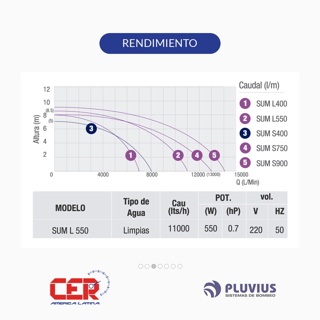 BOMBA SUMERGIBLE DE DRENAJE PLUVIUS MODELO SUM L 550W - 0,75 HP - PARA AGUAS LIMPIAS - 220V